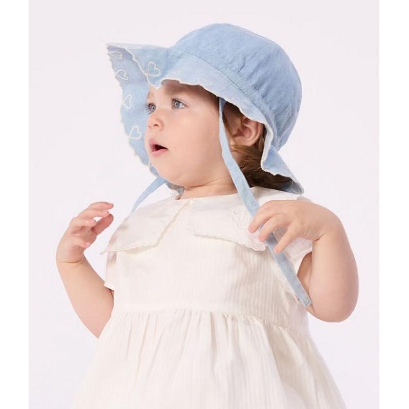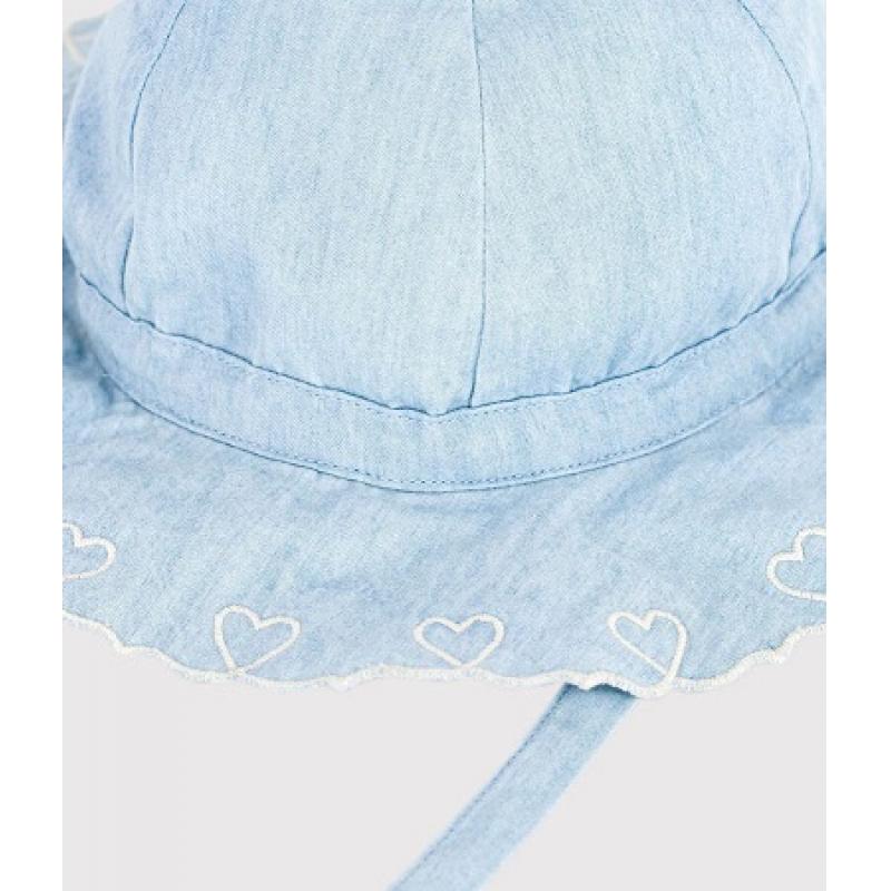 Capeline fille en chambray, une matière légère et confortable. Détails c◊urs brodés pour le côté raffiné